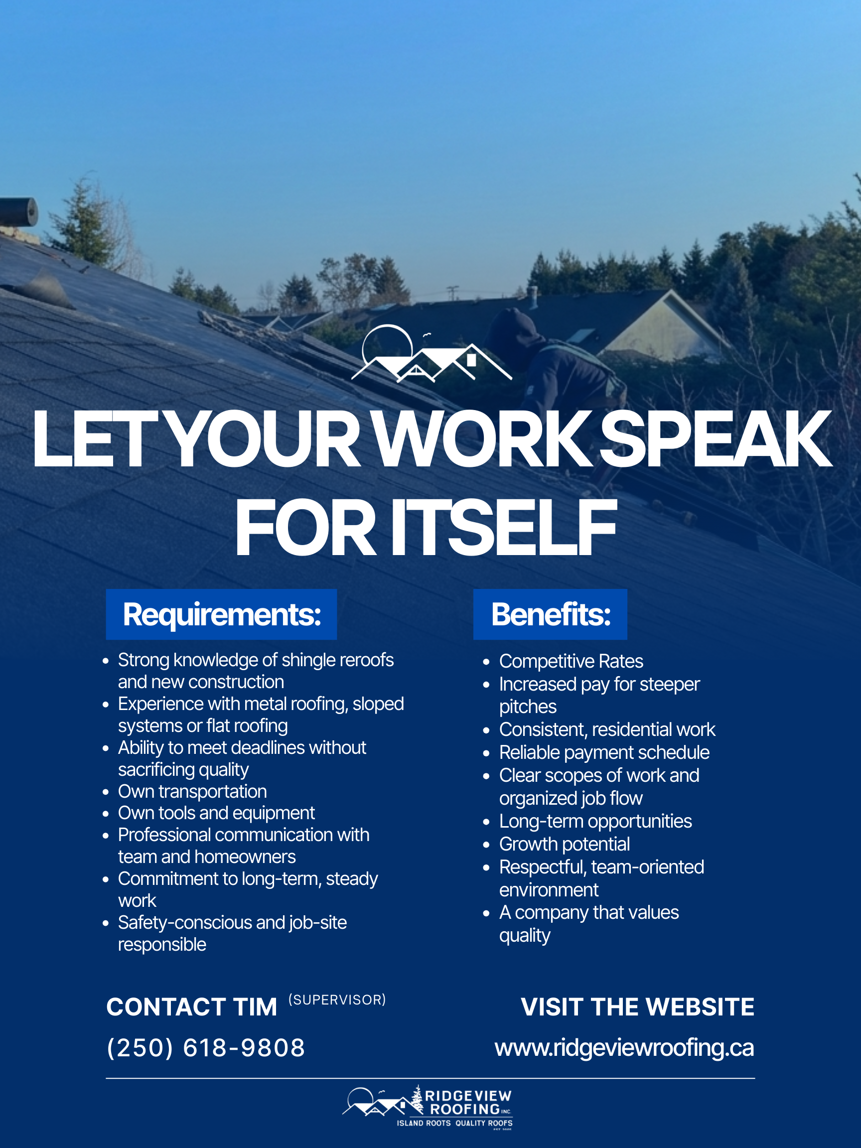 SEND YOUR RESUME TO RIDGEVIEWROOFING.CAREERS@GMAIL.COM